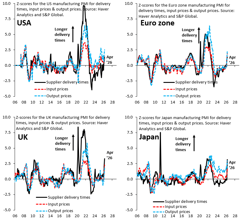 Pentru a înțelege amploarea acestui șoc, Robin Brooks utilizează datele sondajelor manufacturiere compilate de S&P Global, actualizate pentru luna aprilie 2026. Analiza sa se bazează pe calcularea scorurilor Z pentru timpii de livrare ai furnizorilor, prețurile de intrare (ceea ce firmele plătesc furnizorilor) și prețurile de ieșire (ceea ce firmele cer clienților). Scorurile Z reprezintă o metodă statistică de standardizare a datelor, centrându-le în jurul valorii zero și raportându-le la deviația standard. O valoare care depășește pragul de doi, în valoare absolută, indică un șoc statistic major față de media istorică. Această metodologie permite o comparație directă între Statele Unite, zona euro, Marea Britanie și Japonia.