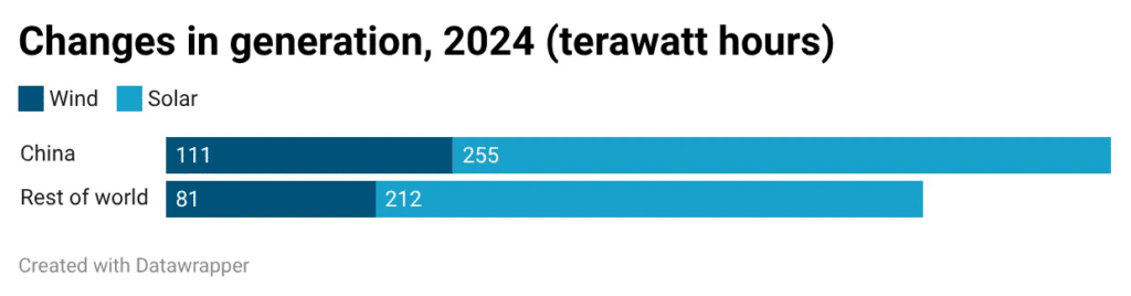 Contrar acestor afirmații, datele arată că, deși China folosește în continuare cantități mari de cărbune, creșterea sa în domeniul energiei eoliene și solare este spectaculoasă. Cererea pentru echipamente depinde de ritmul în care se adaugă noi capacități de generare, iar la acest capitol China depășește restul lumii la un loc.