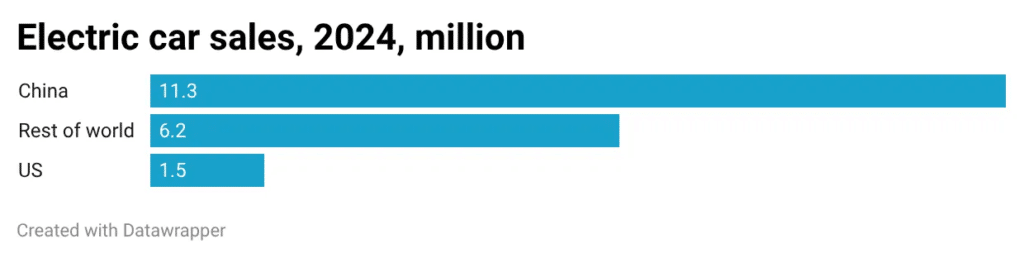 Dominația chineză este vizibilă în mod special în sectorul electrotehnic, care include panourile solare, bateriile și vehiculele electrice. China controlează peste 80 la sută din producția globală în aceste domenii strategice, cu o prezență ușor mai redusă, de 60 la sută, în cazul turbinelor eoliene, unde Europa încă reușește să își păstreze o relevanță semnificativă. Succesul chinez nu este doar rezultatul unor politici industriale deliberate, ci și al unei adoptări rapide a acestor tehnologii pe piața internă. Această piață imensă oferă producătorilor chinezi avantaje economice majore atunci când exportă pe piețele străine. Există o percepție eronată, alimentată de discursurile politice, conform căreia China produce tehnologie verde doar pentru alții, fără a o utiliza ea însăși. Donald Trump a susținut recent că în China nu există parcuri eoliene reale, afirmând: „Ei le fabrică, le vând pe o avere oamenilor proști care le cumpără, dar nu le folosesc ei înșiși. Ridică câteva parcuri eoliene mari, dar nu le folosesc, le pun acolo doar ca să arate oamenilor cum ar putea arăta. Ele nu se învârt, nu fac nimic”.