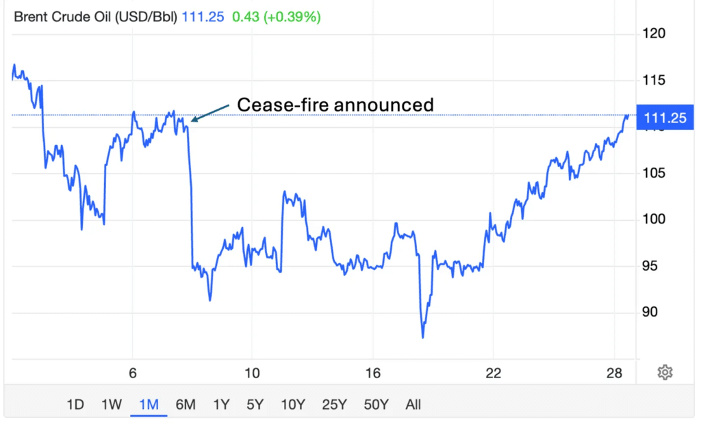 Piețele financiare nu au întârziat să reacționeze la această stare de incertitudine, manifestând un pesimism tot mai accentuat. Evoluția prețului petrolului de tip Brent reprezintă un indicator clar al modului în care investitorii percep riscul actual de aprovizionare. Deși s-a înregistrat o ușoară scădere imediat după anunțarea armistițiului, această tendință a fost aproape complet inversată în ultima perioadă. Scumpirile recente sugerează că speranțele pentru o rezolvare rapidă sunt minime, iar continuarea negării realității de către decidenții politici nu face decât să agraveze starea pieței.