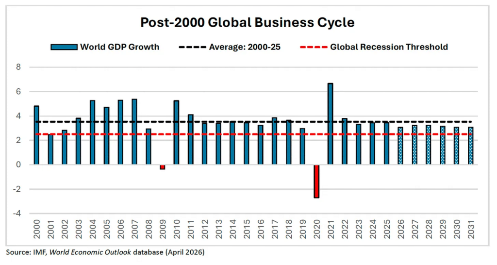 Cadrul de analiză a riscurilor utilizat de Stephen Roach este unul direct și testat în timp. Începând cu anul 2000, economia mondială a crescut cu o rată medie anuală de 3,5%. O recesiune globală este asociată de obicei cu orice valoare situată sub pragul de 2,5%, ceea ce în termeni tehnici înseamnă o scădere reală a PIB-ului mondial pe cap de locuitor. Lumea intră în așa-numita zonă de pericol atunci când creșterea economică încetinește în intervalul cuprins între 2,5% și 3%. La acest ritm lent, sistemul economic își pierde perna de siguranță obișnuită care îi permite să reziste loviturii unui nou șoc major.