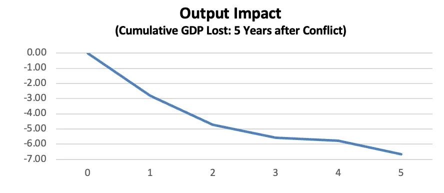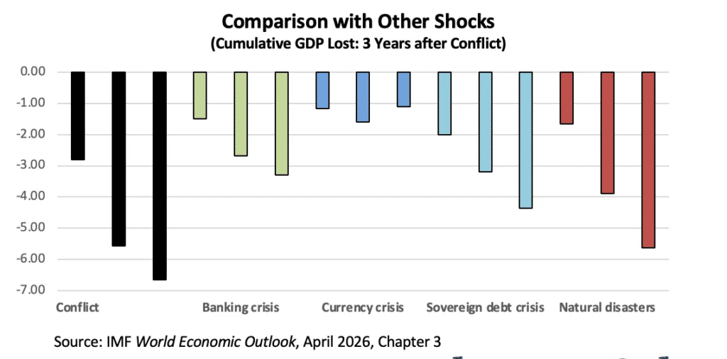 În al treilea rând, impactul macroeconomic al războiului este mult mai grav decât cel al altor tipuri de șocuri economice. Atunci când comparăm pierderile provocate de conflicte cu cele generate de crizele bancare, valutare, ale datoriei suverane sau chiar de dezastrele naturale, războiul rămâne cel mai distructiv factor. Este interesant de observat că dezastrele naturale ocupă locul al doilea, ceea ce nu este surprinzător, având în vedere că atât războaiele, cât și catastrofele naturale implică distrugerea directă a capacității fizice și deteriorarea prelungită a productivității. Aceste efecte sunt mult mai severe decât în cazul crizelor financiare, unde infrastructura rămâne, de obicei, intactă.