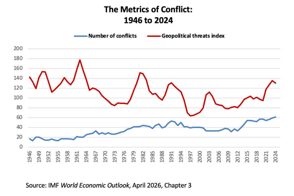 Prima concluzie alarmantă pe care o desprinde Roach vizează tendința istorică a conflictelor, care a devenit de-a dreptul sinistră. Datele arată că numărul conflictelor a urcat la un nivel maxim record pentru perioada de după cel de-al Doilea Război Mondial. Deși cifrele oficiale acoperă perioada până în 2024, datele parțiale pentru anii 2025 și 2026 indică o creștere continuă a numărului de ciocniri armate. Această evoluție este alimentată în principal de conflictele interne, cum ar fi războaiele civile, în timp ce războaiele între state, deși mai rare, au început să crească în frecvență în ultimii ani. Aceste evenimente sunt concentrate în special în Orientul Mijlociu și în Africa subsahariană, fiind monitorizate prin intermediul unui indice al amenințărilor geopolitice care include riscurile nucleare, terorismul și acumulările de forțe militare.