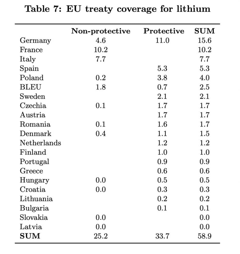 Acoperirea agregată este aproape de 59%. Cea mai mare parte a acesteia provine din trei tratate, toate cu cea mai importantă țară de rezervă, Chile. Franța și Italia au fiecare câte un acord neprotectiv cu Chile, iar Germania are un acord protector. A doua cea mai importantă țară de rezervă este Australia. Dar, așa cum s-a arătat mai sus, există doar tratate cu cinci țări est-europene, economic mai mici, astfel că tratatele lor adaugă mai puțin de trei puncte procentuale la acoperire, în ciuda rezervelor mari din Australia. În contrast, statele membre ale UE au o acoperire bună a tratatelor în ceea ce privește a treia cea mai mare țară de rezervă, Argentina. Există un total de 18 tratate, care implică cele 14 cele mai mari țări ale UE în funcție de PIB (ignorând Irlanda). Dar, deoarece Argentina deține doar puțin peste 17% din rezervele în exploatare, acoperirea extinsă a tratatelor UE adaugă doar 16 puncte procentuale la acoperirea totală pentru rezervele în exploatare.