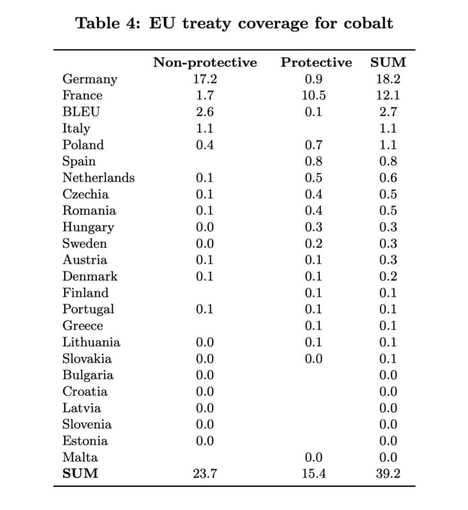 Germania are un acord din 1971. Acesta nu este protector, parțial deoarece nu permite ISDS, ci doar soluționarea litigiilor între state. Acest lucru ar părea în mod normal o constrângere majoră asupra eficacității unui acord. Dar, așa cum s-a menționat mai sus, din cauza aspectului geopolitic al acestor rezerve, ar putea exista un interes la nivelul guvernului german în aplicarea acordului. Celălalt acord major este cu Franța. Acest acord protector reprezintă două treimi din acoperirea UE provenită din acorduri protective pentru cobalt. Există, de asemenea, un tratat neprotector între BLEU (Belgia și Luxemburg) și Congo (Dem.), care este neobișnuit, deoarece a intrat în vigoare în 2021, la 16 ani după ce a fost semnat.