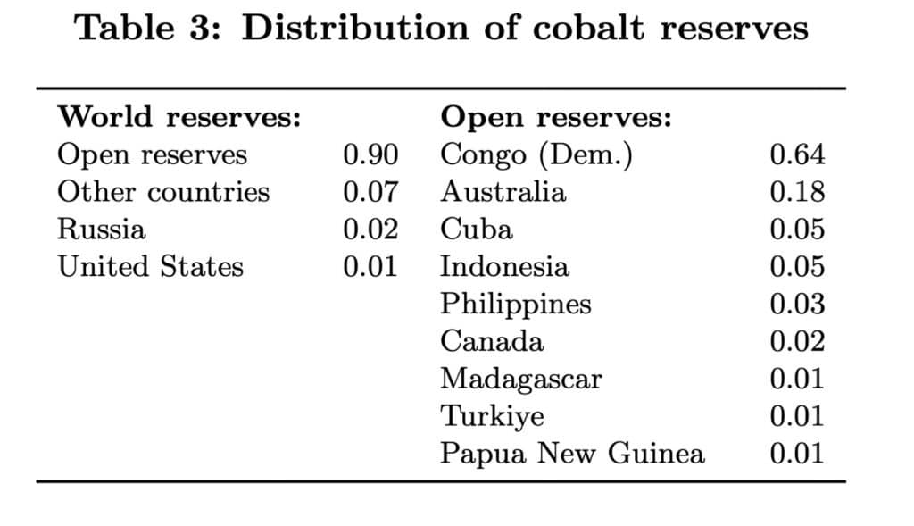 Tabelul 3 oferă distribuția rezervelor mondiale de cobalt. Cele mai multe dintre rezerve sunt în exploatare. Există, de asemenea, șapte procente care, conform U.S. Geological Survey (2024), sunt listate ca fiind situate în “alte țări”, care, prin urmare, ar putea fi disponibile și pentru investiții din partea UE. Competitorii strategici ai UE au doar rezerve foarte mici.