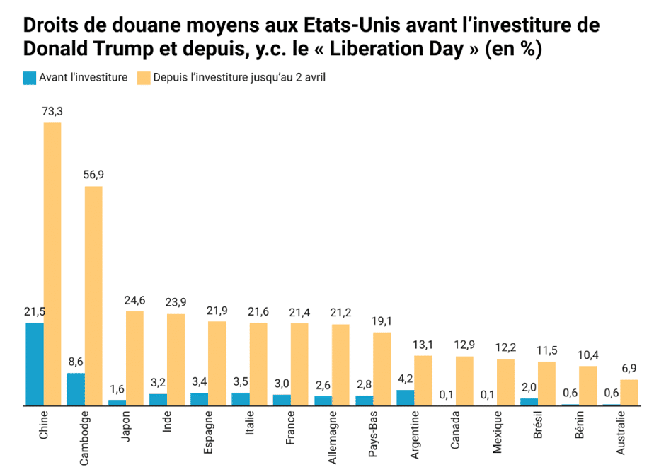 Această creștere a protecției variază de la un partener la altul în funcție de deciziile președintelui, dar și în funcție de compoziția sectorială a exporturilor fiecărei țări. Astfel, China este cea mai afectată, cu o creștere de peste 50 de puncte procentuale (pp), urmată de Cambodgia (48,3 puncte procentuale), în timp ce Australia își vede exporturile către Statele Unite afectate de doar 6,3 pp suplimentare.